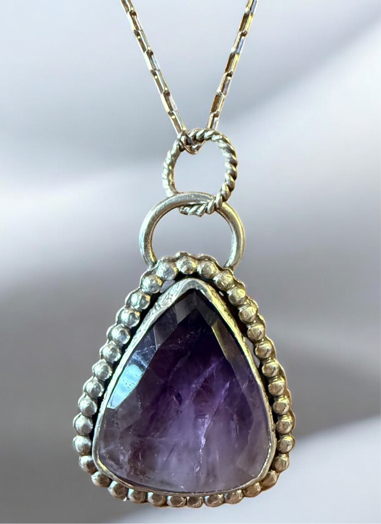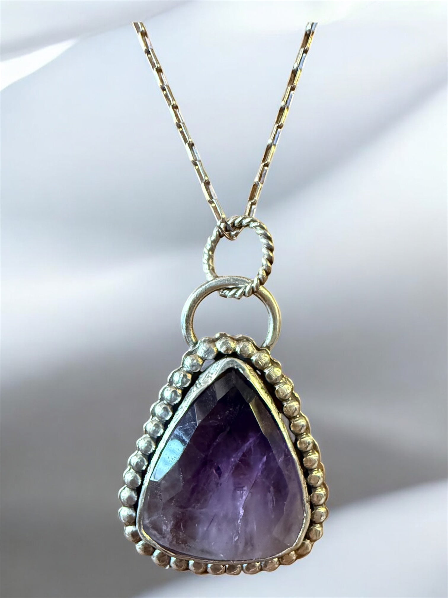 Elevate your style with our stunning Amethyst necklace. This large amethyst stone is set in a sterling silver pendant and hangs on a delicate sterling silver chain. The perfect accessory to add a touch of elegance and spirituality to any outfit. Treat yourself or a loved one today!