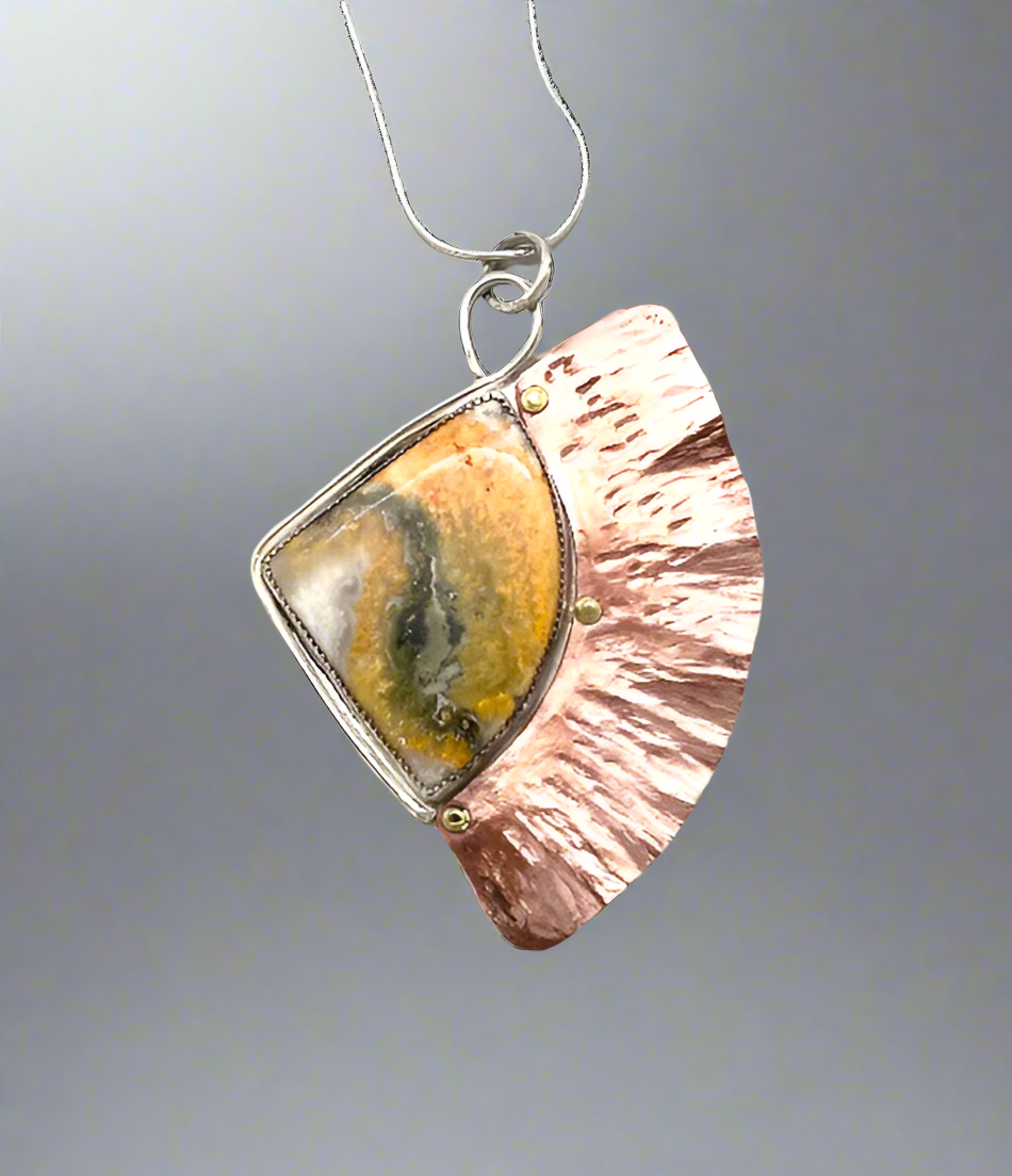 Embrace adventure with this Bumble Bee Fan necklace. Crafted with Bumble Bee Jasper, set in sterling and fold formed copper, this stunning accessory is sure to make a statement. Channel your daring spirit and take risks with this bold and unique necklace. Only for the bold and brave!