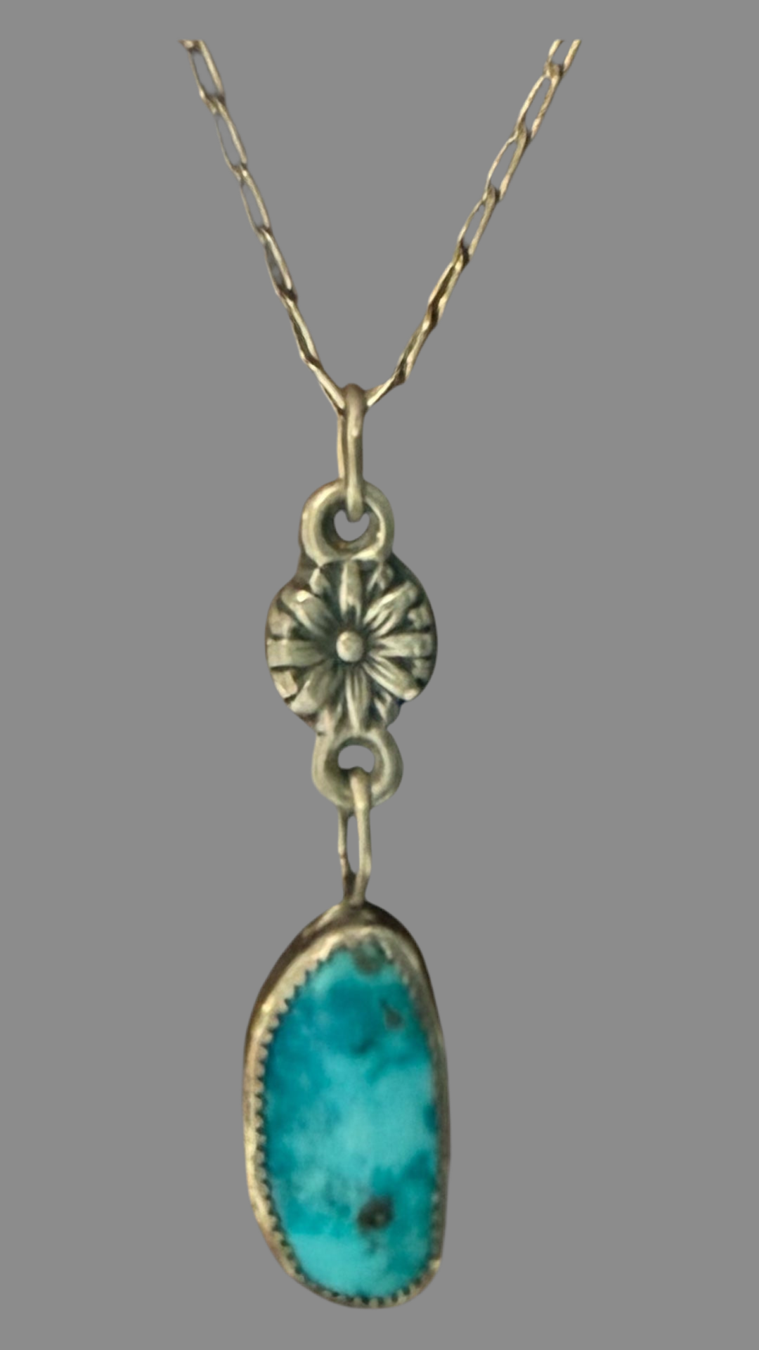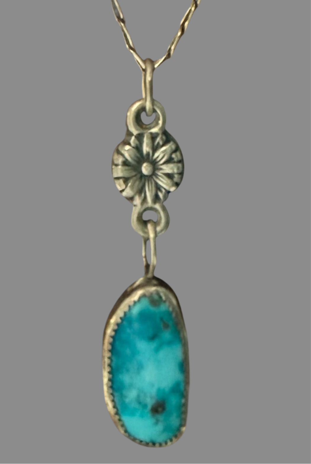 This daisy turquoise necklace combines the natural beauty of turquoise with the delicate charm of sterling silver daisies. Perfect for adding a touch of whimsy to any outfit, this necklace is sure to make a statement.